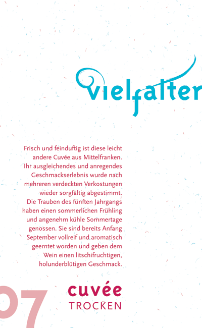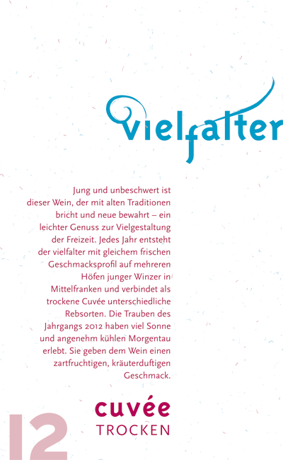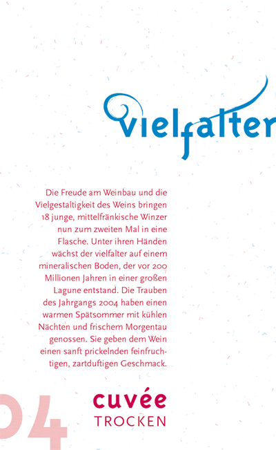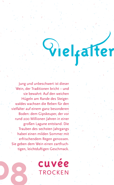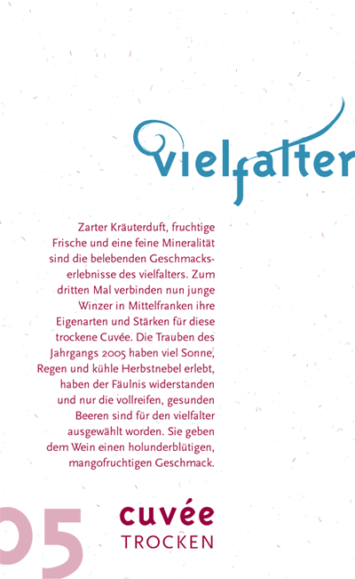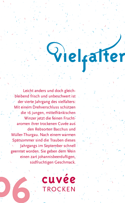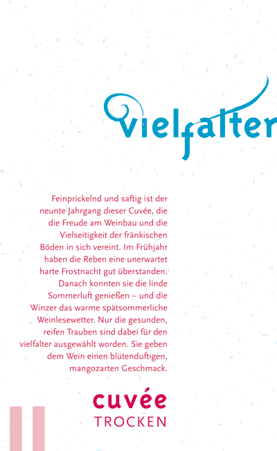 Jedes Jahr erzählt ein kurzer Text auf dem Vorderetikett Neues und Bewährtes über das Aufwachsen und die Persönlichkeit des vielfalters. Die Etiketten aller Jahrgänge können Sie sich hier ansehen.